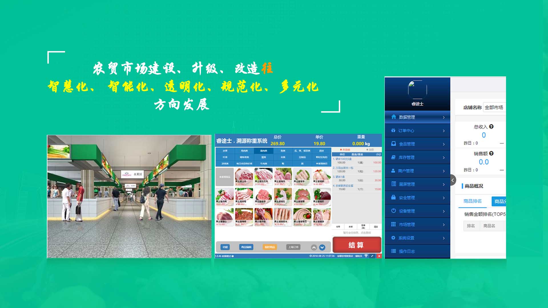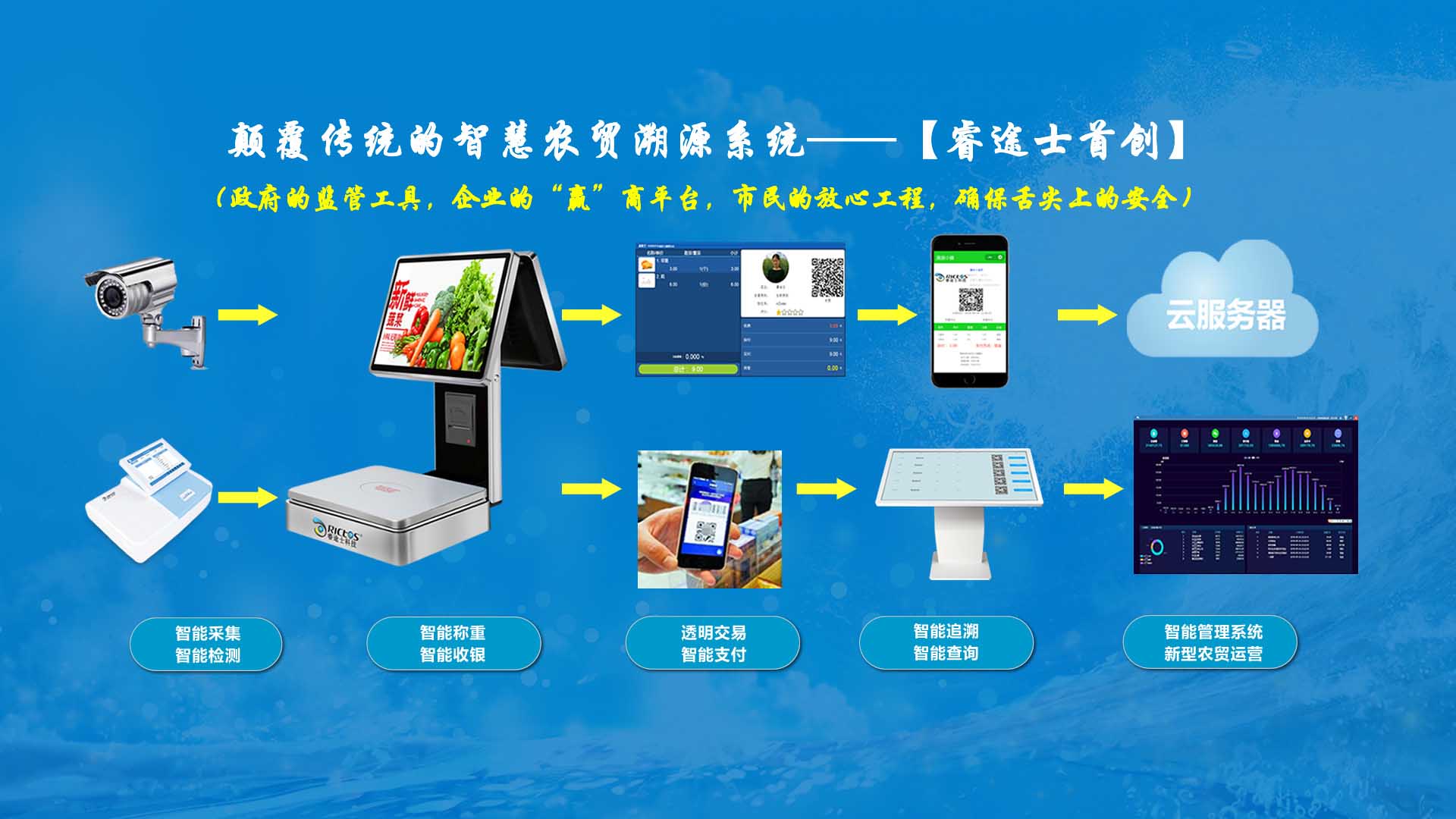創(chuàng)新實(shí)現(xiàn)了【智慧農(nóng)貿(mào)溯源管理系統(tǒng)】與【智能稱重收銀】一體化解決方案,集市場管理、運(yùn)營管理、溯源追溯、智能收銀大數(shù)據(jù)運(yùn)用于一體,硬件、軟件與管理系統(tǒng)完美結(jié)合。適用于農(nóng)批、農(nóng)貿(mào)市場蔬菜、生鮮、水果、水產(chǎn)、肉類、熟食等稱重和非稱重銷售;由于采用一體化設(shè)計(jì),解決了傳統(tǒng)農(nóng)貿(mào)市場無法實(shí)現(xiàn)的信息化、智能化、可追溯的管理問題;使稱重、收銀、追溯、管理、更透明、公正、安全,讓顧客無后顧之憂,給管理工作帶來極大的便捷與高效,對國內(nèi)農(nóng)產(chǎn)品行業(yè)的發(fā)展、農(nóng)產(chǎn)品流通管理起到了典范作用。 【睿途士首創(chuàng)】顛覆傳統(tǒng)的“智慧農(nóng)貿(mào)市場系統(tǒng)”,解決了傳統(tǒng)農(nóng)貿(mào)系統(tǒng)單一安卓掛屏,昂視不方便看、不直觀、無互動(dòng)性,傳輸信息不齊全、不穩(wěn)定的問題,也解決了按鍵電子秤商品難找、商品代碼難記、按鍵操作不靈活、支付不智能,對收銀管理、銷售商品、菜名、菜價(jià)、打折、優(yōu)惠、會員、線上下單、采購等無法實(shí)現(xiàn)實(shí)際菜品交易和追溯等問題。 更具顛覆性的是睿途士智慧系統(tǒng)擁有三大管理平臺(市場管理平臺、總部運(yùn)營管理平臺、商戶后臺管理平臺)、一個(gè)可視操作前臺和三大追溯功能,讓遠(yuǎn)程管理、數(shù)據(jù)傳輸、人機(jī)互動(dòng)、智能控制、移動(dòng)支付、大數(shù)據(jù)、互聯(lián)通信、云端存儲、人工智能、智能城市、電子定位、智能收銀等功能得以實(shí)現(xiàn)。